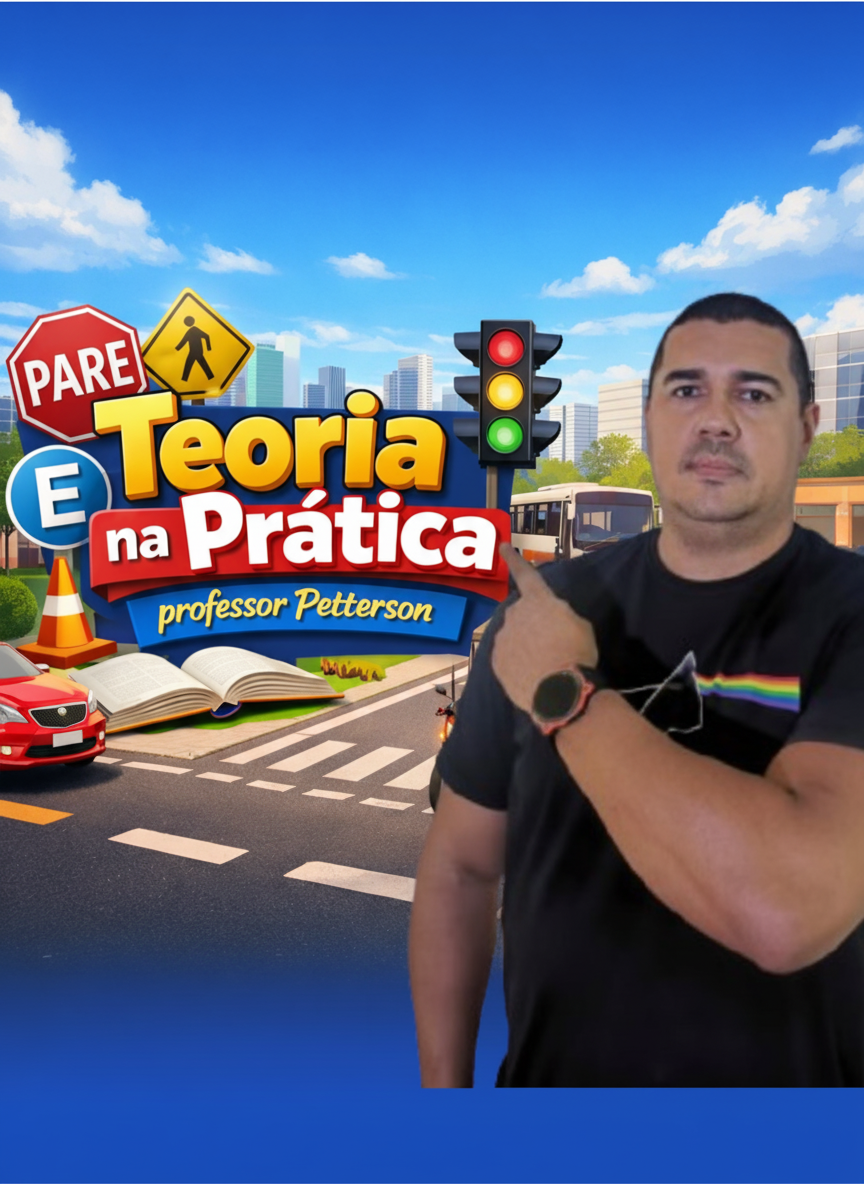 “Teoria e na Prática” é um curso teórico de educação no trânsito desenvolvido pelo professor Petterson, especialista em legislação de trânsito com mais de duas décadas de experiência. O projeto combina conteúdos fundamentados nas resoluções vigentes de 2025 com uma abordagem didática e acessível, preparando candidatos à habilitação não apenas para aprovação na prova teórica, mas para uma condução segura e responsável.O visual do curso reforça essa proposta: elementos urbanos reais (semáforo, placas de trânsito, veículos), um livro aberto representando o aprendizado estruturado, e a presença do instrutor criando proximidade e confiança para retirar e sanar suas dúvidas no conteúdo. Tudo isso comunica que o aluno aprenderá legislação de forma clara, prática e aplicável ao dia a dia nas ruas.